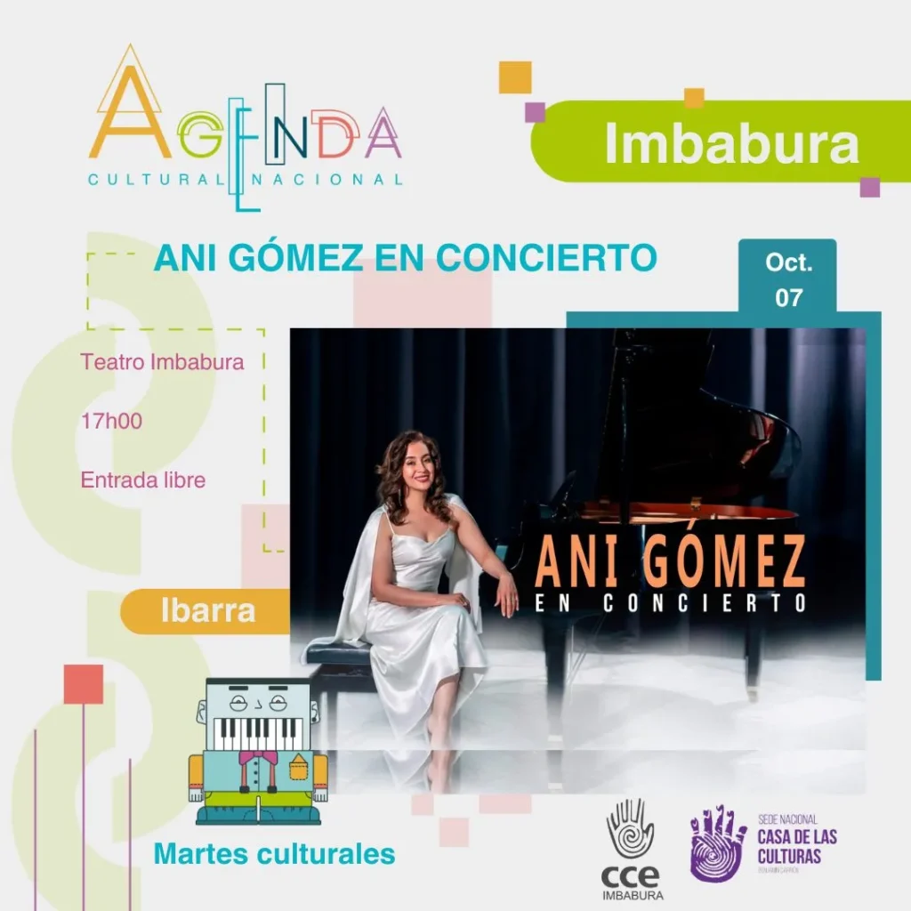 La artista Ani Gómez se presentará en concierto el martes 7 de octubre de 2025 en el Teatro Imbabura, ofreciendo un espectáculo que reunirá su más reciente repertorio musical y una selección de temas representativos de su trayectoria artística.