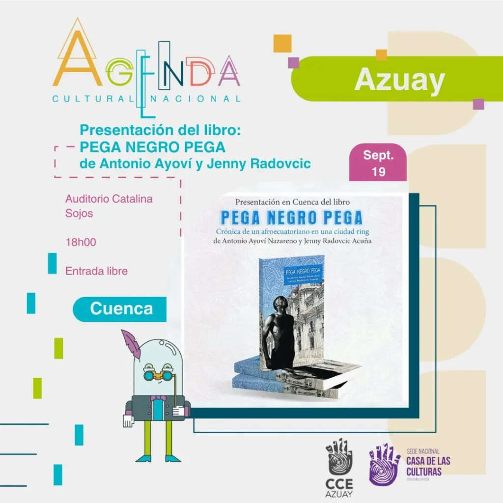 La Casa de la Cultura Núcleo del Azuay invita a la presentación del libro Pega negro pega, crónica de un afroecuatoriano en una ciudad ring, escrito por Antonio Ayoví Nazareno y Jenny Radovcic Acuña. Este evento literario busca acercar al público a una obra que refleja identidad, memoria y lucha desde la perspectiva afroecuatoriana.Fecha: viernes 19 de septiembre de 2025