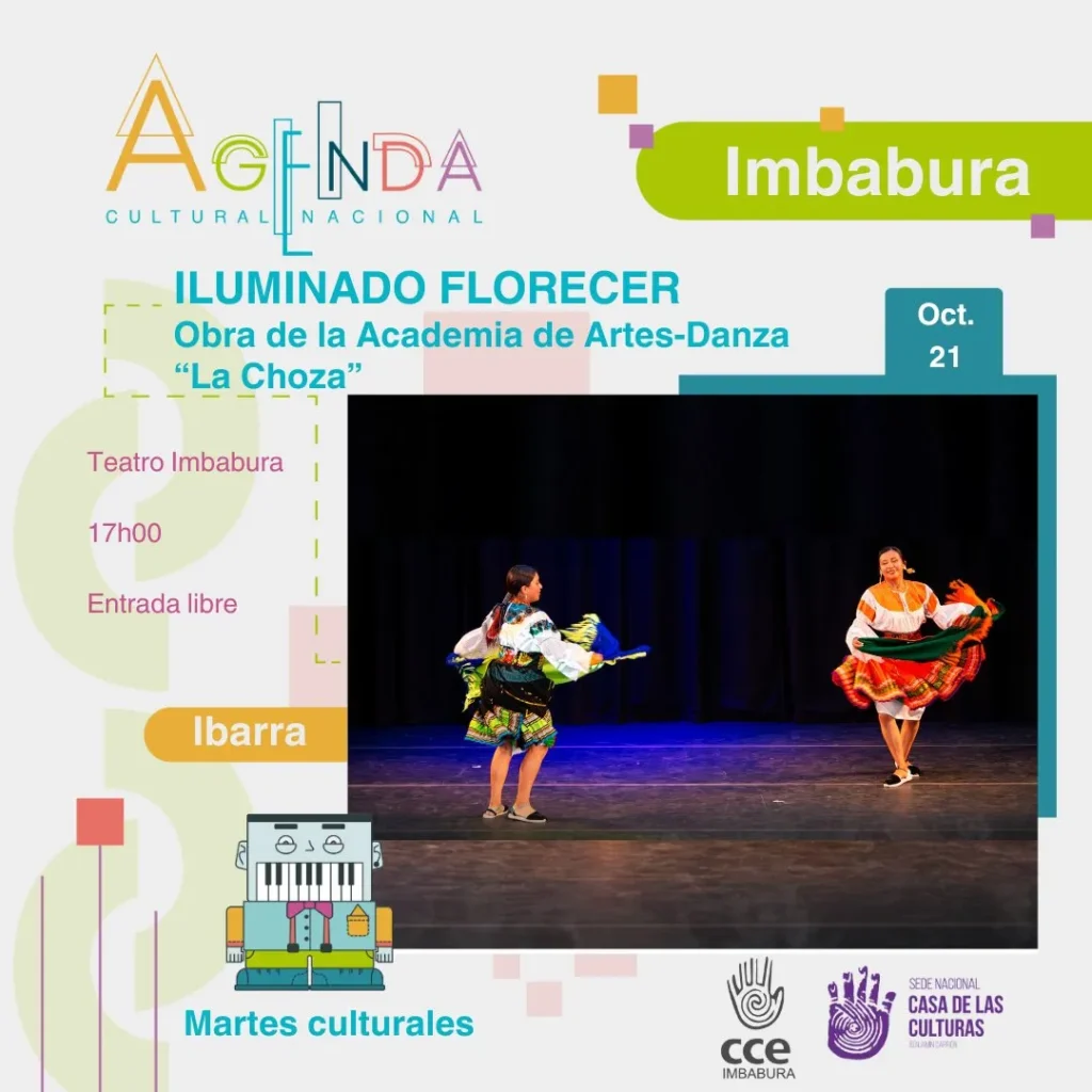 La Casa de la Cultura Ecuatoriana, Núcleo de Imbabura, presenta una nueva edición de sus Martes Culturales con la obra “Iluminado Florecer”, a cargo de la Academia de Artes y Danza “La Choza”. Este espectáculo reúne talento local en una puesta en escena que combina arte, movimiento y tradición, invitando al público a disfrutar de una experiencia cultural enriquecedora.