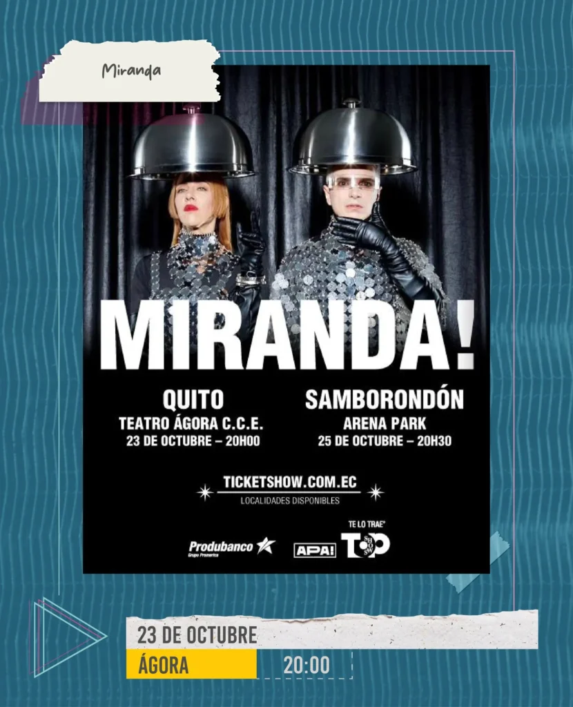 El icónico grupo pop argentino integrado por Ale Sergi y Juliana Gattas, promete un espectáculo lleno de energía, con un repertorio que combina sus grandes éxitos y nuevas versiones incluidas en su más reciente álbum. Será una noche de pop, color y nostalgia para los fanáticos ecuatorianos.