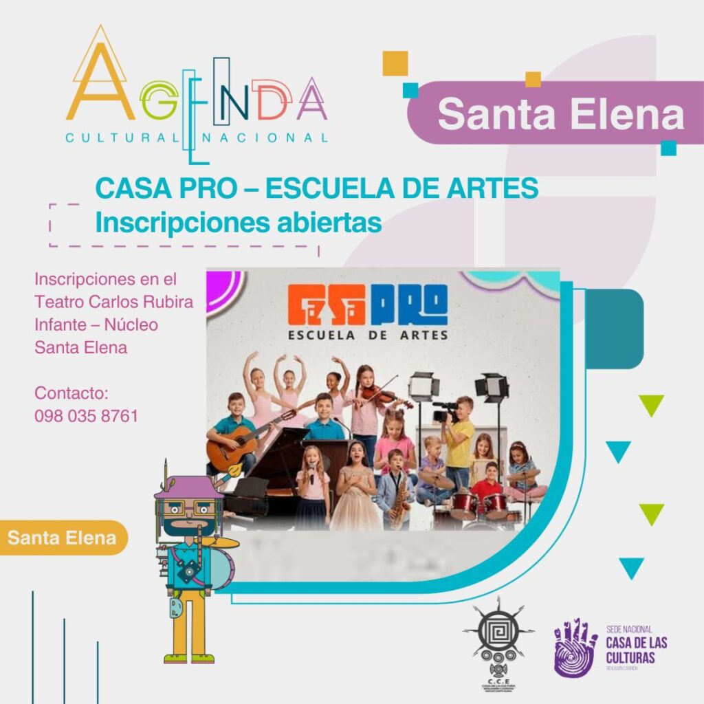 La Casa de la Cultura Ecuatoriana, Núcleo de Santa Elena, anuncia la apertura de inscripciones para CASA PRO – Escuela de Artes, un programa formativo dirigido a niños y jóvenes interesados en desarrollar sus talentos artísticos. La oferta académica incluye música (guitarra, piano, violín, canto, saxofón y batería), artes plásticas y manualidades (dibujo, pintura, bisutería, tejido, tarjetería y muñecas de trapo), así como artes escénicas y formativas (danza, ballet, baile urbano, modelaje y oratoria). Esta iniciativa busca fortalecer la educación artística en la provincia y fomentar la creatividad desde edades tempranas.