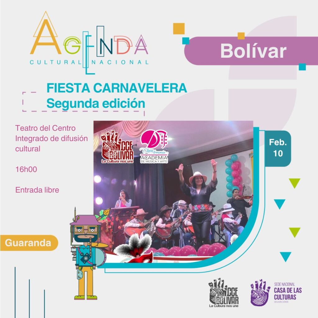 La Casa de la Cultura Ecuatoriana, Núcleo de Bolívar, en coordinación con la Academia de Música y Arte “Clave Armonía”, invita a la segunda edición de la Fiesta Carnavelera, un evento cultural y artístico que celebra las tradiciones del Carnaval a través de la música y el arte. La actividad se desarrollará el martes 10 de febrero de 2026 en el Teatro del Centro Integrado de Difusión Cultural de la CCE Bolívar, con acceso abierto para toda la ciudadanía, promoviendo la participación cultural y el fortalecimiento de la identidad local.