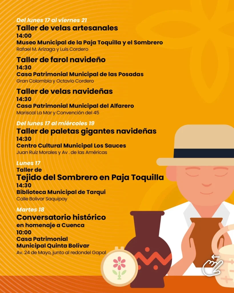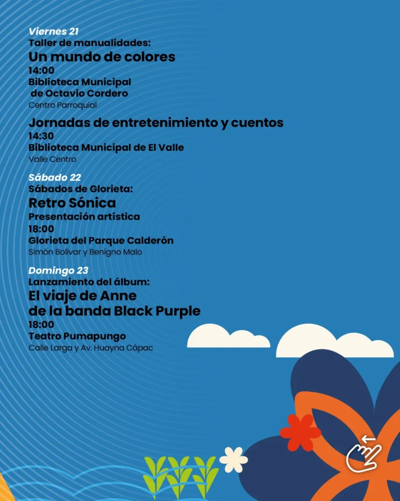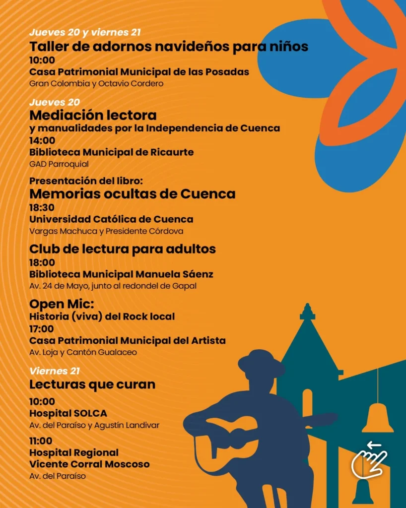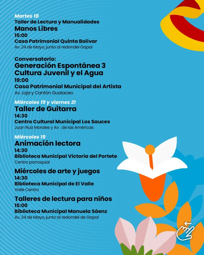 La Dirección Municipal de Cultura de Cuenca presenta una nueva programación semanal que reúne propuestas formativas, artísticas y literarias en diversos espacios patrimoniales, bibliotecas y centros culturales del cantón. Esta agenda busca fortalecer los procesos creativos, promover el acceso a la lectura y activar la participación ciudadana mediante talleres, conversatorios, jornadas de mediación lectora y presentaciones artísticas.