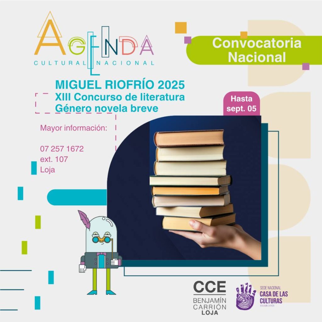 Convocatoria abierta al XIII Concurso Nacional de Literatura Miguel Riofrío 2025, organizado en coordinación con la Fundación Miguel Riofrío. Este certamen literario está dirigido a autores ecuatorianos que deseen dar a conocer su talento en el género de novela breve.