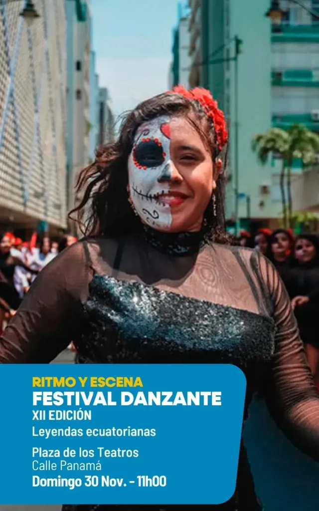 El Festival Danzante XII se llevará a cabo el domingo 30 de noviembre de 2025, a las 11:00, en la Plaza de los Teatros, ubicada en la calle Panamá e Imbabura. La Alcaldía de Guayaquil invita a la ciudadanía a disfrutar gratuitamente de esta programación cultural que fortalece el patrimonio y promueve el desarrollo artístico de la ciudad.