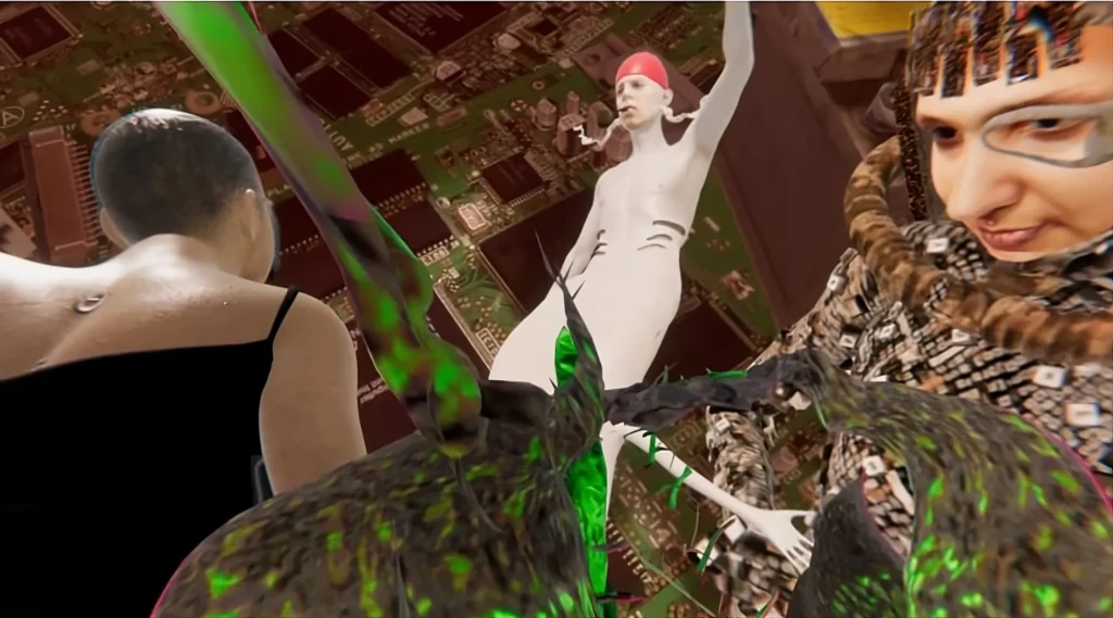 La exposición presenta tres obras en video: UTTERING (2023), VIRUS BECOMING (2022) y TRANSMUTATE (2023), que proponen un recorrido inmersivo en el que los visitantes se encuentran con entidades mutantes, paisajes digitales y narrativas fragmentadas. La propuesta busca generar una experiencia sensorial y reflexiva que invite a imaginar futuros posibles desde perspectivas de género, disidencia y resistencia.