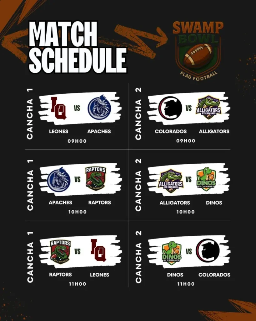 La jornada contará con la participación de Dinos, Raptors y Alligators, conjuntos de la estructura deportiva de Caimanes Football Team, además de equipos invitados que completan un calendario oficial ya confirmado. El torneo promete intensidad, velocidad y una dinámica diferente gracias al formato 5v5, que continúa ganando terreno dentro del football ecuatoriano.