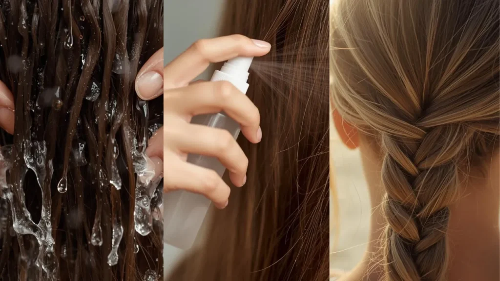 • Peinados protectores: Las trenzas o moños son ideales para mantener el cabello recogido y evitar enredos o daños mecánicos durante el baño.
